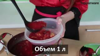 Этот контейнер-классика тапервер.Огромный плюс за прозрачность,что редкость у этой фирмы.Материал изделия не окрашивается,не впитывает запахи,потому что не входит в реакцию с продуктами, поэтому в нем можно хранить что угодно и легко мыть.Рекомендую.