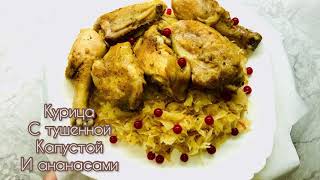Курица с тушенной капустой и ананасами.