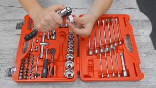1/2": 12, 13, 14, 15, 17, 18, 19, 22, 24, 27, 30, 32 мм, свечные 1/2": 16, 21 мм, удлинитель 1/2": 125, 250 мм, трещотка 1/2": 45 зубов, карданный шарнир 1/2", 1/2": 4, 5, 6, 7, 8, 9, 10, 11, 12, 13 мм, длинные 1/4": 7, 12 мм, удлинитель 1/4": 100, 150 мм, трещотка 1/4": 45 зубов, вороток т-образный 1/4": 115 мм, гибкий удлинитель 1/4": 150 мм